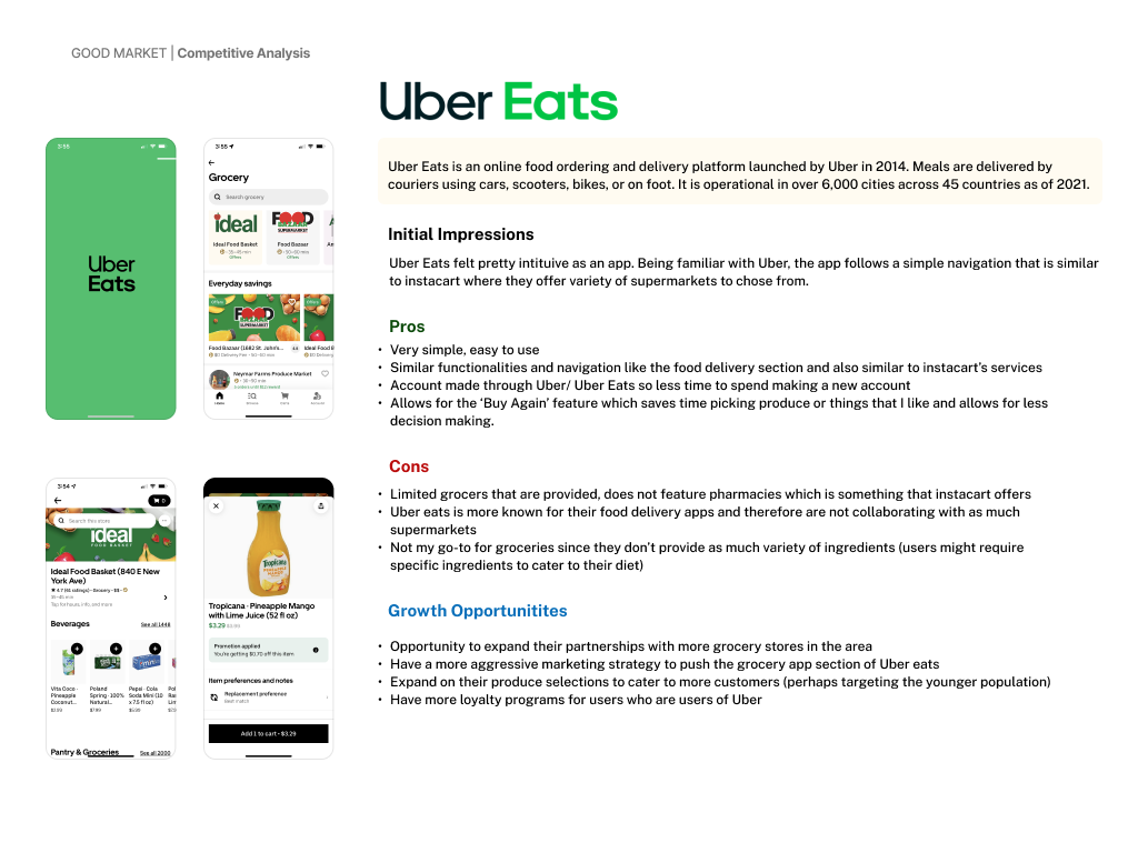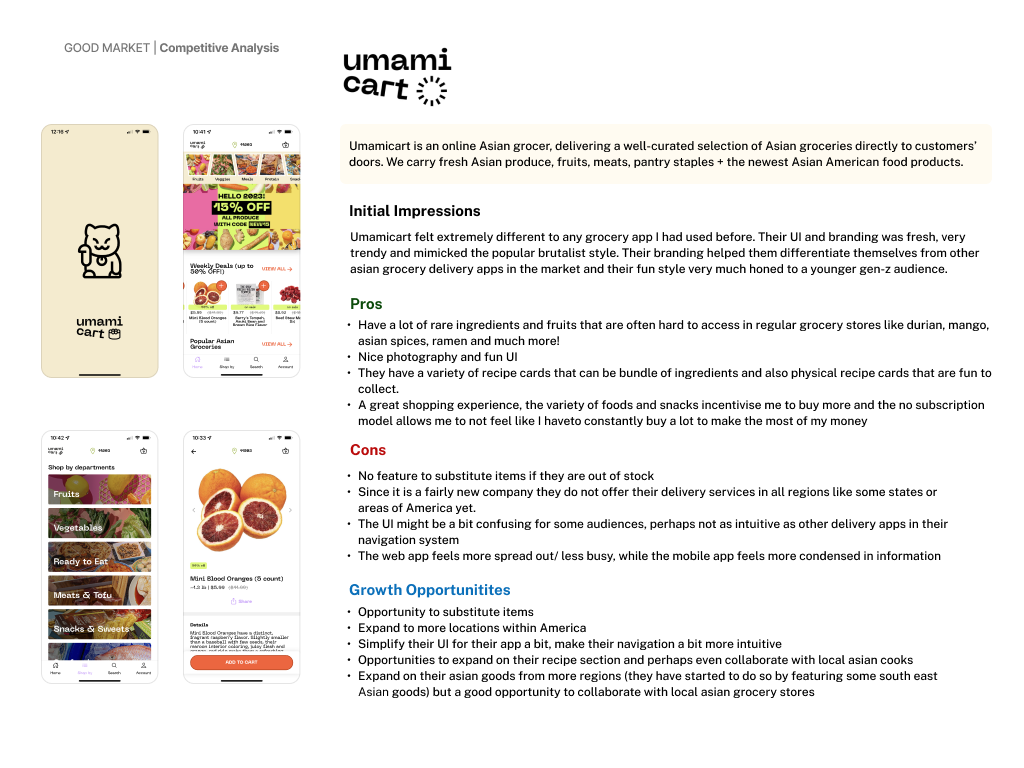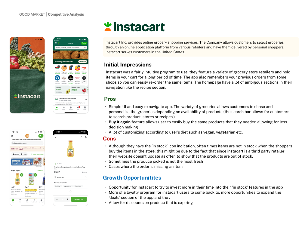 Good Market is a fictitious, mid-sized grocery franchise based in the United States. While customer satisfaction ratings has remained relatively stable over the past four years, the company has experienced an 8% annual decline in market share. If this trend continues, Good Market risks losing its competitive position and long-term viability.Market and user research revealed that this decline is largely driven by the rapid growth of online grocery ordering and delivery services such as FreshDirect and Instacart. Customers gravitation to these platforms are due to their speed, convenience, and flexibility—allowing them to shop anytime, from anywhere.